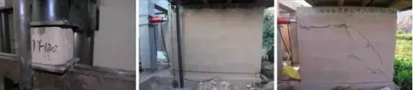 另一種更為真實準確的方法是直接進行墻片的現場抗剪實驗。在馬鞍橋村,結構工程師進行了這種實驗:首先在一個混凝土做的框架上夯筑幾片墻體(可以調整每片墻體里石灰/水泥的配比,進行比較)。然后用千斤頂對墻體進行頂推(混凝土框架起到支撐千斤頂反力的作用),看多大的力量可以破壞墻體。