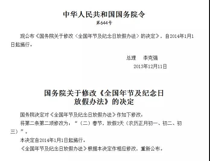 2013 年 12 月,發(fā)布了關(guān)于修改《全國年節(jié)及紀(jì)念日放假辦法的決定》,新修改的辦法指出:將第二條第二項修改為:"(二)春節(jié),放假 3 天(農(nóng)歷正月初一、初二、初三)"。本決定自 2014 年 1 月 1 日起施行。