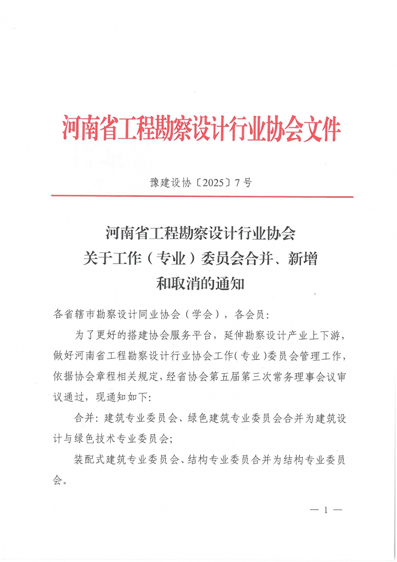 各省轄市勘察設計同業協會(學會),各會員: 為了更好的搭建協會服務平臺,延伸勘察設計產業上下游,做好河南省工程勘察設計行業協會工作(專業)委員會管理工作,依據協會章程相關規定,經省協會第五屆第三次常務理事會議審議通過,現通知如下: 合并:建筑專業委員會、綠色建筑專業委員會合并為建筑設計與綠色技術專業委員會;裝配式建筑專業委員會、結構專業委員合并為結構專業委員會。 新增:河南省工程勘察設計協會管道業委員會 取消:河南省工程勘察設計行業協會工程總承包工作委員會 2025年3月17日