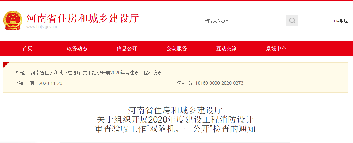 為進一步加強全省建設工程消防設計審查驗收工作,規(guī)范建設工程消防設計審查驗收行為,落實各方責任主體消防設計、施工質量責任與義務。根據(jù)《河南省住房和城鄉(xiāng)建設廳關于印發(fā)2020年度“雙隨機、一公開”年度抽查計劃的通知》(豫建法〔2020〕149號),決定開展2020年度全省建設工程消防設計審查驗收工作“雙隨機、一公開”檢查。現(xiàn)就有關事項通知如下: